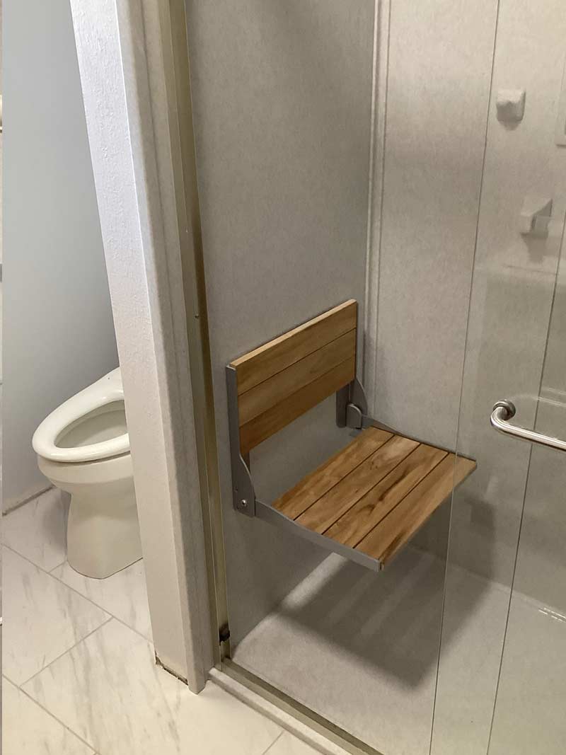 Installation of an Onyx COllection Shower with Brushed Nickel Fixtures and Flip Down Teak Seat