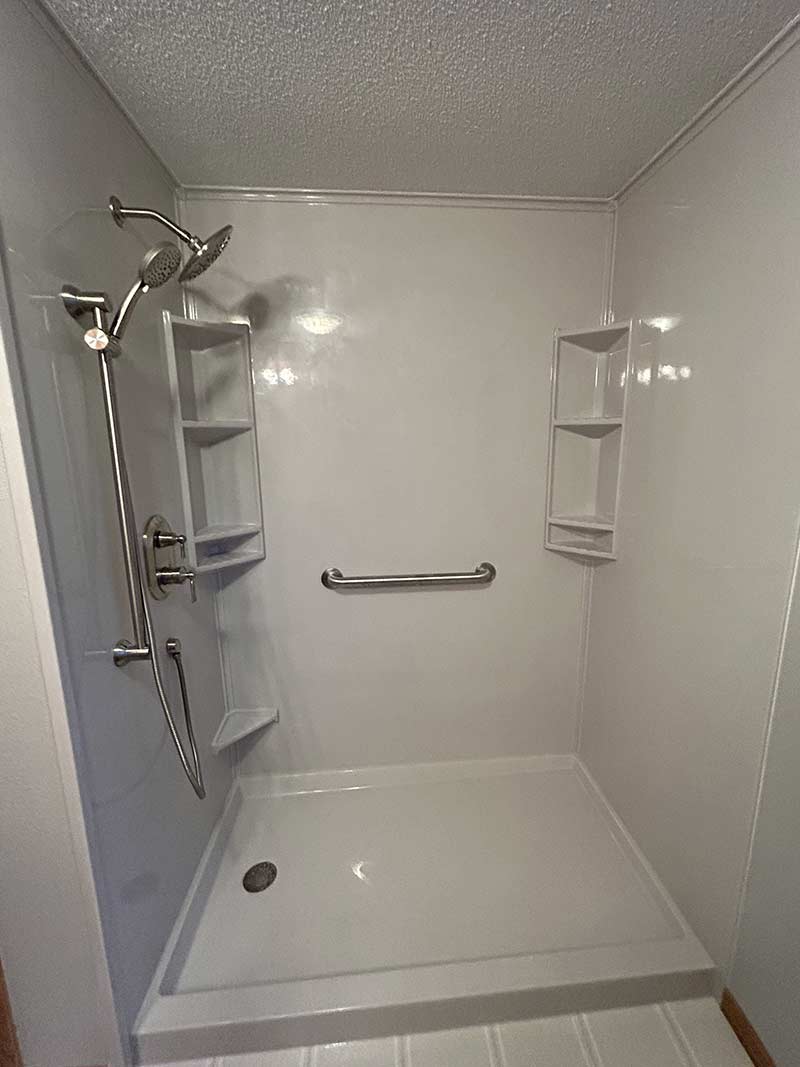 Tear out of old Tub/Shower Combo unit and replaced with a beautiful easy entry Onyx Collection Shower with Handheld system
